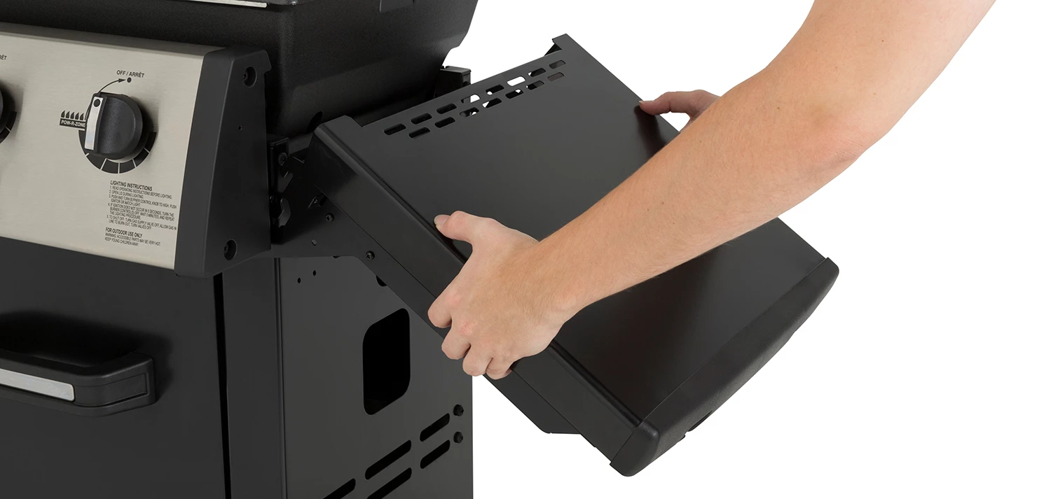 Die beiden klappbaren Seitenablagen sind aus wetterfestem Kunststoff gefertigt und besitzen integrierte Zubehörhaken. Zum Verstauen können beide Ablagen unkompliziert nach unten geklappt werden.