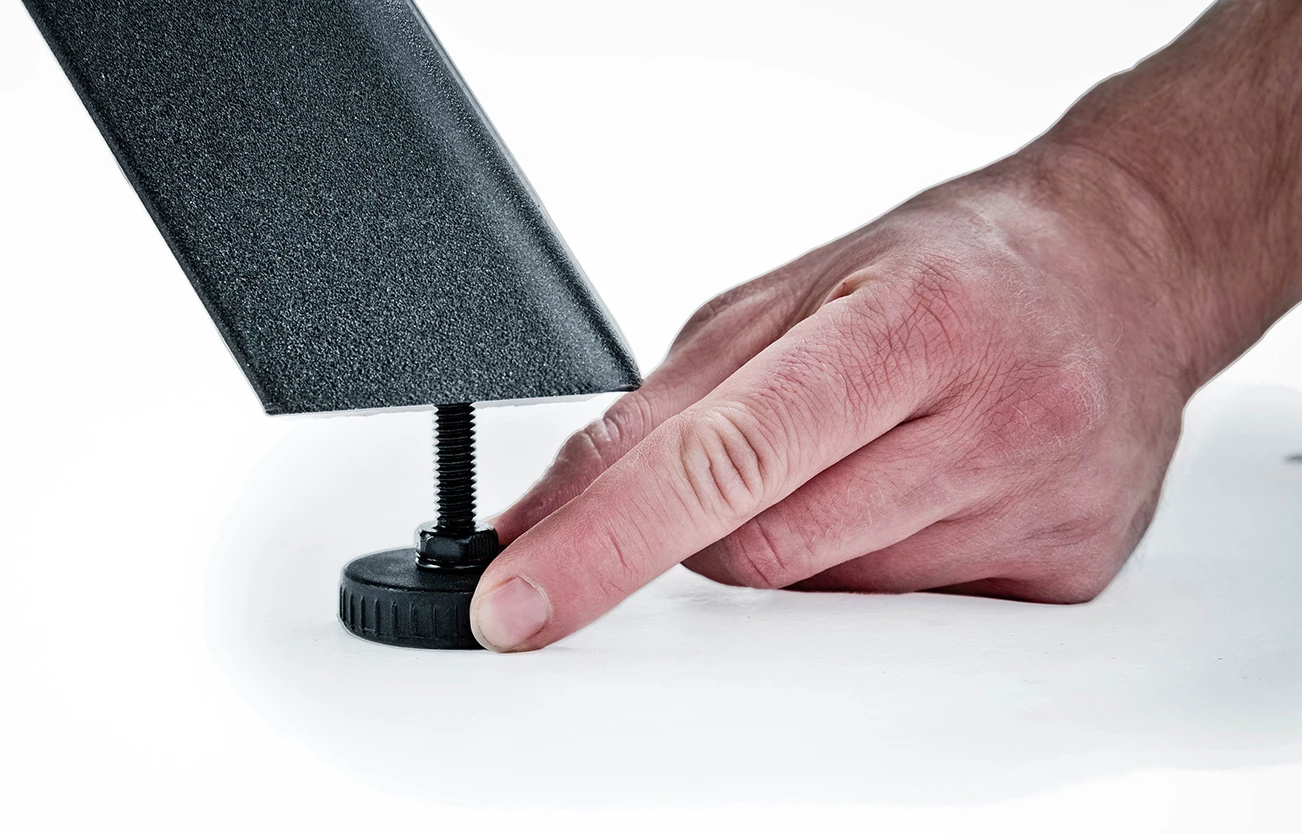 - Sehr robuster Standfuß – beinhaltet 2 Rollen und 2 höhenverstellbare Füße