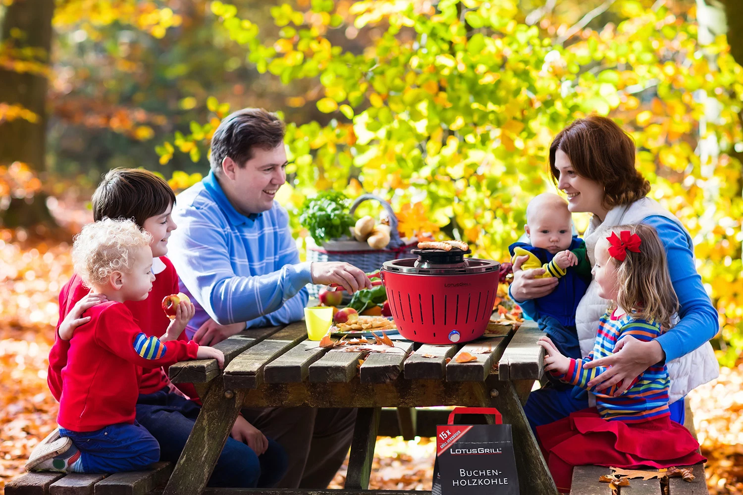 Der LotusGrill Classic in Feuerrot – einfach entzünden und raucharm grillen