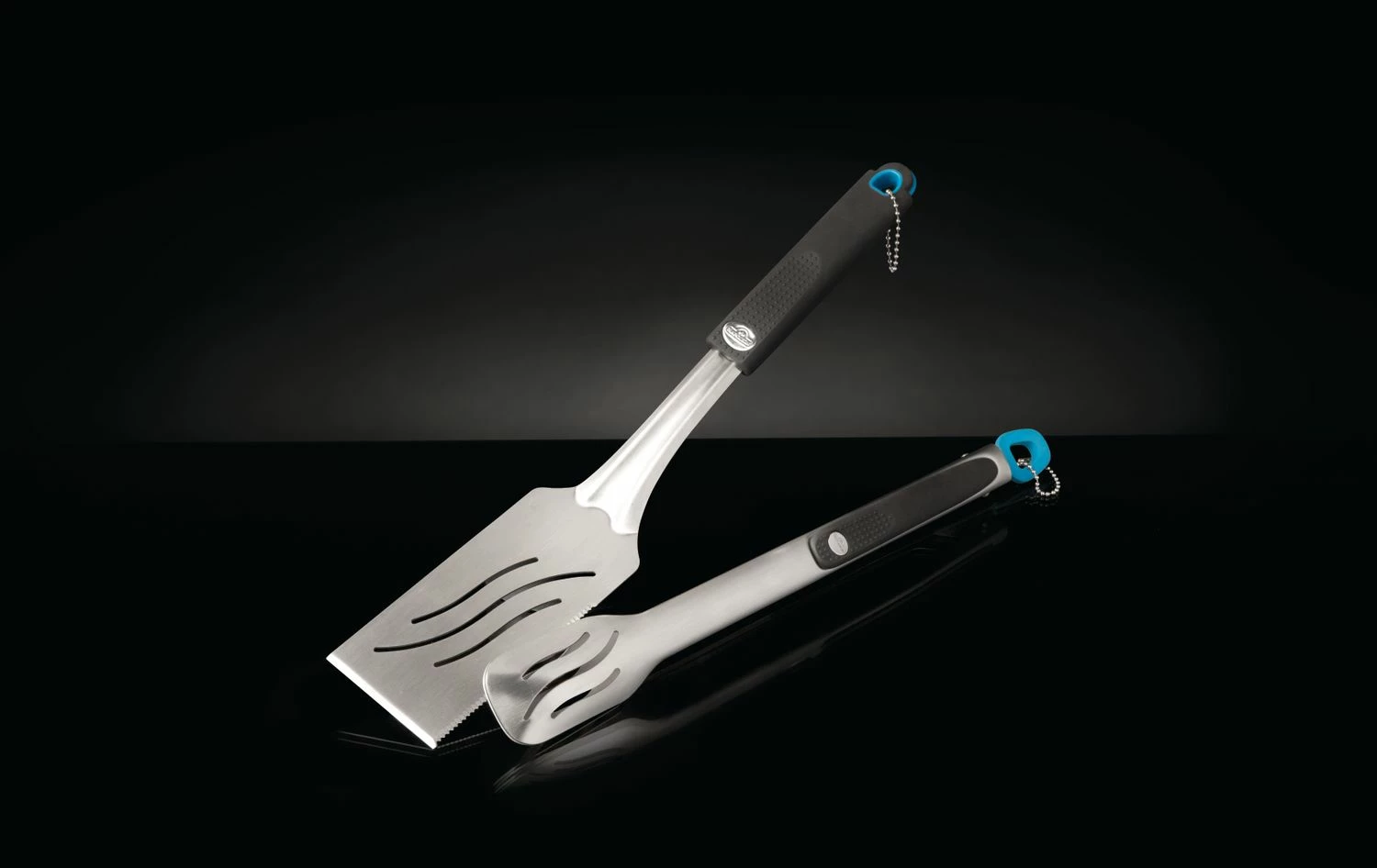 Das 2 teilige Napoleon Grillbesteck Set besteht aus einem Pfannenwender und einer Zange aus Edelstahl mit ergonomischen Griffen. Durch die Soft-Touch-Grip Oberfläche bietet das hochwertige Besteck Set eine besonders komfortable Haptik.