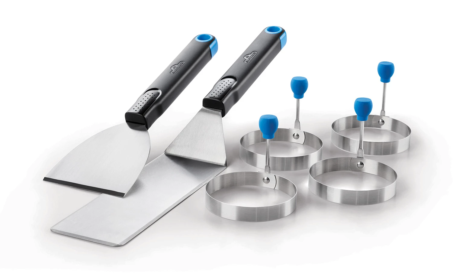 Das Set enthält einen Grillwender, einen Schaber und vier Universalringe mit einem Innendurchmesser von 8,5 cm.
