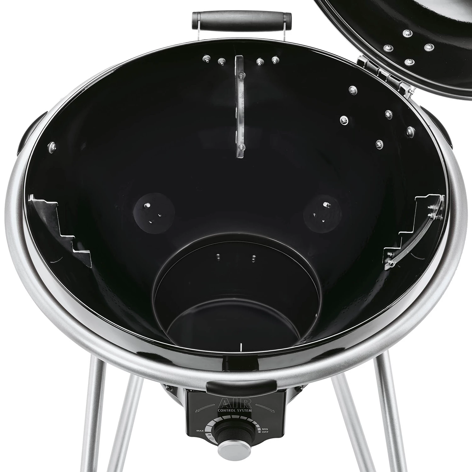 Das neue, innovative AIR Control System lässt sich im wahrsten Sinne des Wortes im Handumdrehen steuern. Hierfür befindet sich unterhalb der Grillkugel auf Höhe des Aschebehälters ein großer Drehknopf, mit welchem sich die Menge der Zuluft regulieren lässt. Zusammen mit dem im Deckel integrierten Thermometer bietet sich Ihnen also die Möglichkeit, die Temperatur im Inneren der Garkammer exakt an die Bedürfnisse anpassen zu können. Damit sind auch temperaturkritische Gerichte kein Problem mehr.